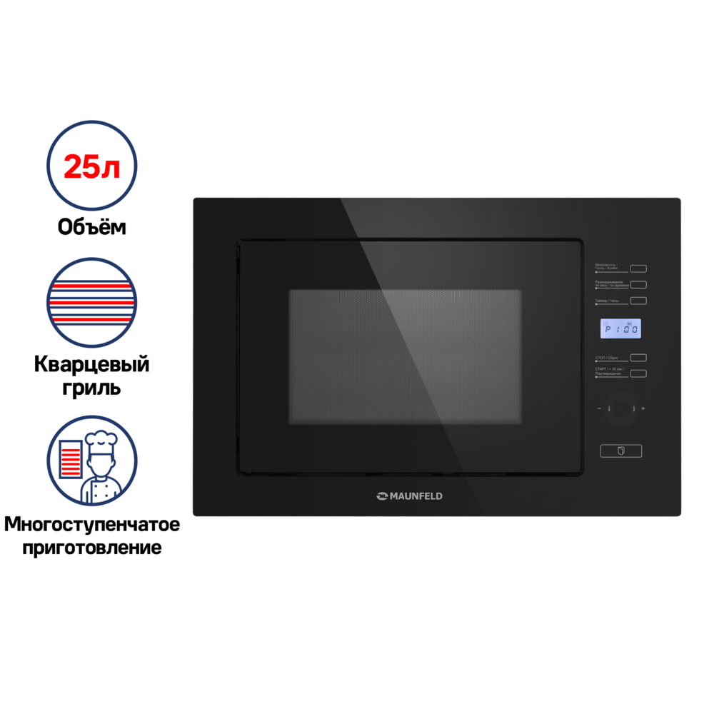 Фасад из прочного стекла, дисплей, таймер, часы, замок от детей, открытие дверцы в любом режиме, звуковой сигнал, подсветка камеры, дверца навесная, открывание дверцы-кнопка